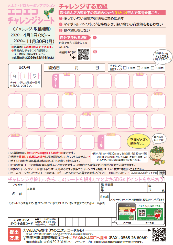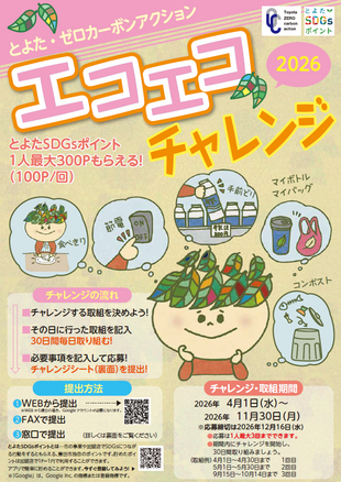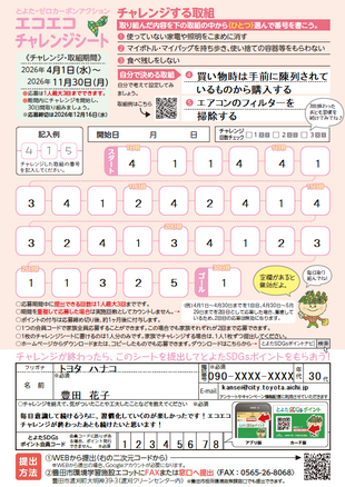 「エコエコチャレンジ2026」のチラシ・台紙は、豊田市環境政策課、環境学習施設eco-T(エコット)、各支所、交流館、豊田市自然観察の森などに置いてあります(令和8年3月27日以降順次配架)。又ホームページからもダウンロードしていただけます。